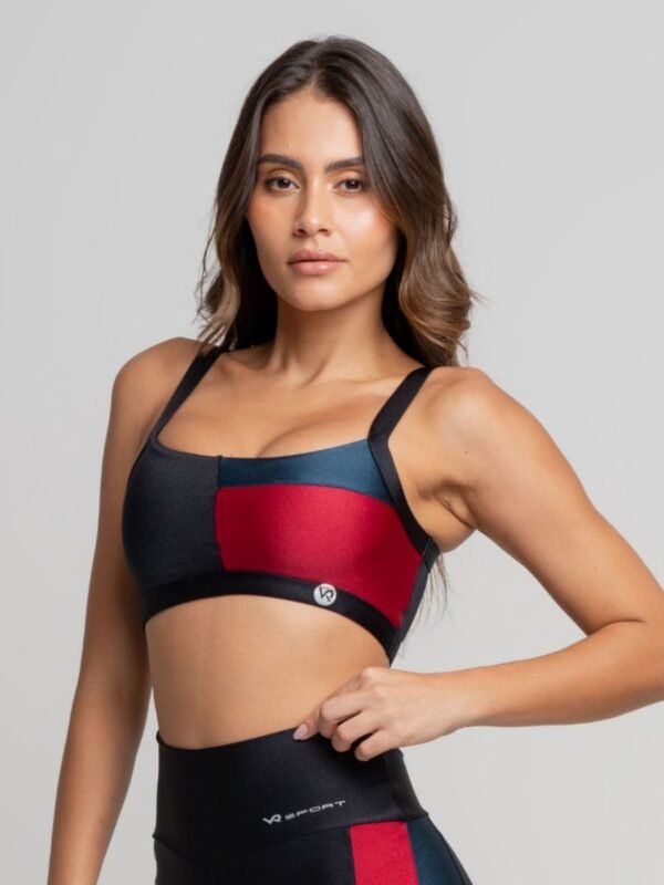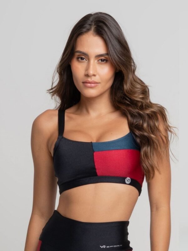 Top Fitness Preto com Recortes Glow Azul e Vermelho